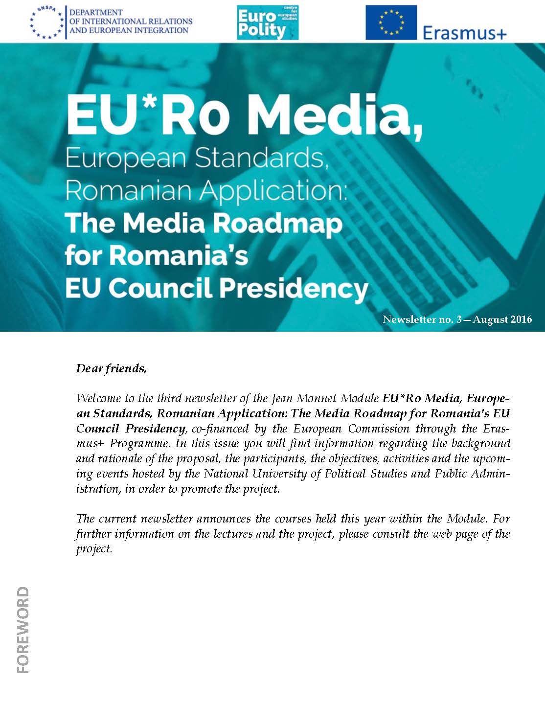 Welcome to the third newsletter of the Jean Monnet Module EU*Ro Media, European Standards, Romanian Application: The Media Roadmap for Romania's EU Council Presidency, co-financed by the European Commission through the Erasmus+ Programme. In this issue you will find information regarding the background and rationale of the proposal, the participants, the objectives, activities and the upcoming events hosted by the National University of Political Studies and Public Administration, in order to promote the project.